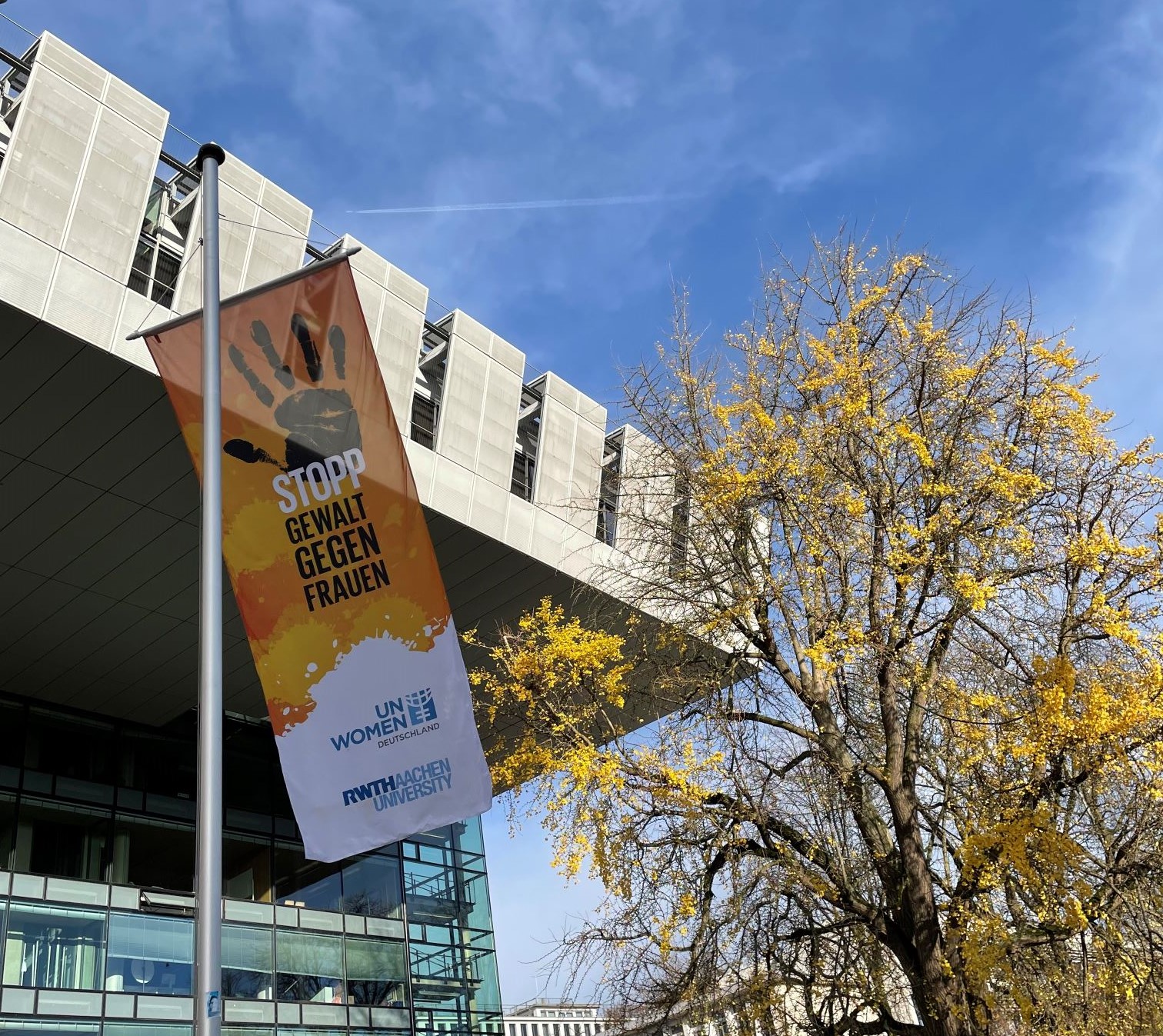 Auch in diesem Jahr setzt die RWTH ein Zeichen gegen patriarchale Gewalt und beteiligt sich bereits zum fünften Mal an der UN-Kampagne Orange the World. Vom 25. November bis 10. Dezember – dem Tag der Menschenrechte – hisst die RWTH orangefarbene Fahnen vor dem Hauptgebäude als Symbol für eine Zukunft ohne patriarchale Gewalt. |